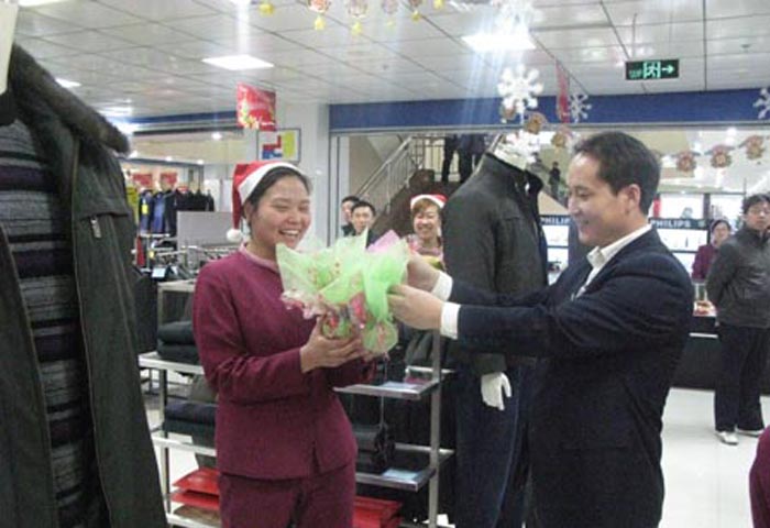 帶著圣誕的吉祥,捧著真摯的祝福,包上2010年的平安、送上一份快樂、在這即將開啟新的扉頁的前夕,家樂園百貨廣場店領導把這吉祥、平安、快樂、幸福親自傳遞到公司的每一個員工。12月24日,家樂園百貨廣場店為包含家電商場聯營員工在內的1300余名員工每人包上了一份象征吉祥、平安的平安果。這份平安果由公司綜合部組織員工親自包裝,24日晚公司領導分組到基層親自為每名員工送去一份平安,同時更帶去了公司領導對全體員工的慰問,領導的一句平安快樂,員工的一聲真誠致謝,匯集了團隊的和諧音符。