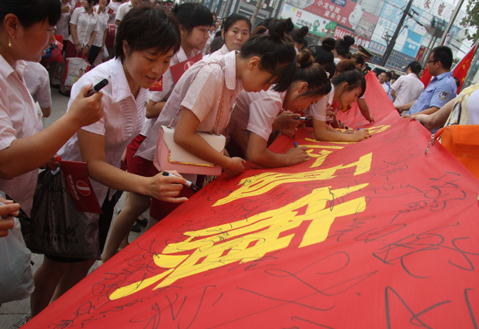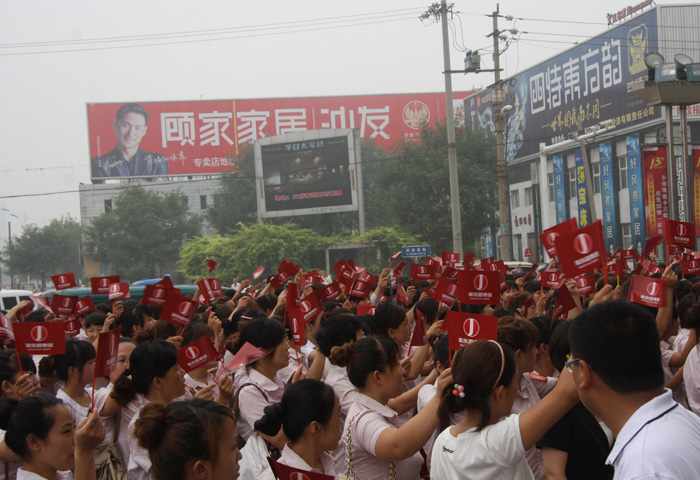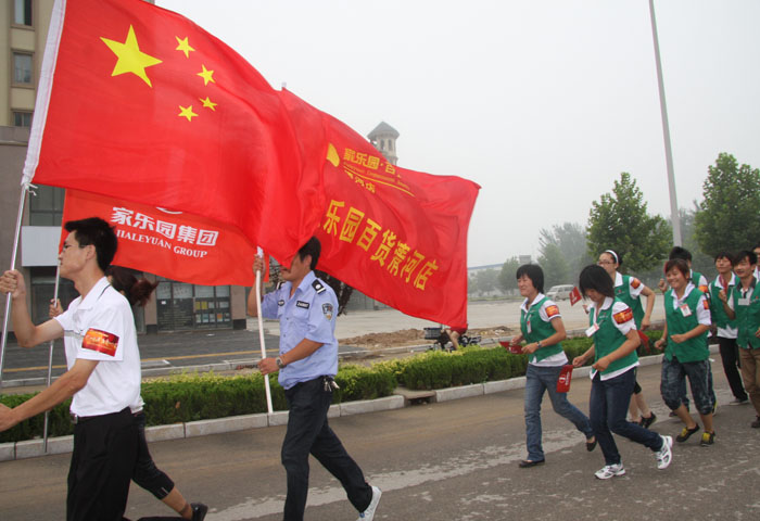 為慶祝家樂園集團13周年慶典,回饋父老鄉(xiāng)親的支持與厚愛,家樂園集團以“同傳一面旗,共愛一個家”為主題,舉辦了所有家樂園人共同參與的萬人司旗傳遞儀式,自集團總部出發(fā),在經(jīng)歷了新世紀(jì)店、中興店、廣場店、內(nèi)丘店、寧晉天寶店、寧晉天一廣場、巨鹿店后,在7月9日終于到達了家樂園清河店。經(jīng)過半個小時的傳遞,司旗在超市、百貨、家電所有家樂園人的護衛(wèi)下,走過了3500米的征程,最后由門店總經(jīng)理張潔親手交回集團護旗手的手中,完成了司旗在清河店的傳遞!
