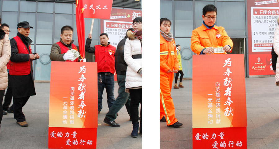 1月13日清晨,“為奉獻(xiàn)者奉獻(xiàn)——向烈士張曉凱捐獻(xiàn)一元基金活動(dòng)”啟動(dòng)儀式在家樂(lè)園集團(tuán)天一廣場(chǎng)隆重舉行。捐獻(xiàn)儀式開(kāi)始,在身著儀仗服裝服務(wù)人員的引導(dǎo)下,四個(gè)精致的捐款箱由指定人員放置現(xiàn)場(chǎng),數(shù)千名來(lái)自市區(qū)部分企事業(yè)單位、愛(ài)心社團(tuán)人員以及社會(huì)民眾自覺(jué)排成長(zhǎng)隊(duì),為烈士張曉凱奉獻(xiàn)自己一份真摯的愛(ài)心。家文化是家樂(lè)園集團(tuán)的企業(yè)文化符號(hào),“家文化一元基金”是家樂(lè)園集團(tuán)員工首創(chuàng)發(fā)起的公益基金活動(dòng),這是繼一元基金向魯?shù)闉?zāi)區(qū)捐款后,第二次在社會(huì)上綻放出愛(ài)的絢麗之花。